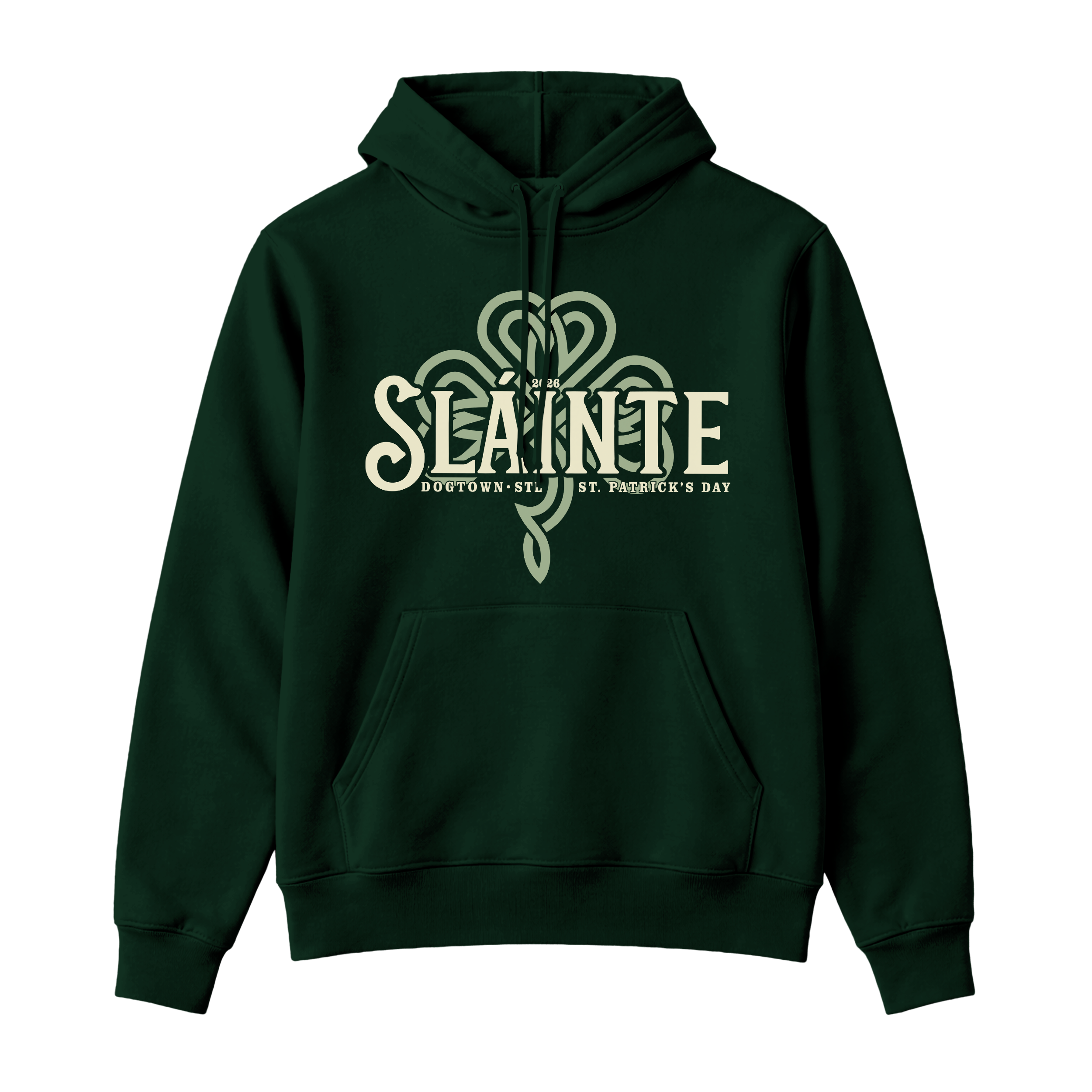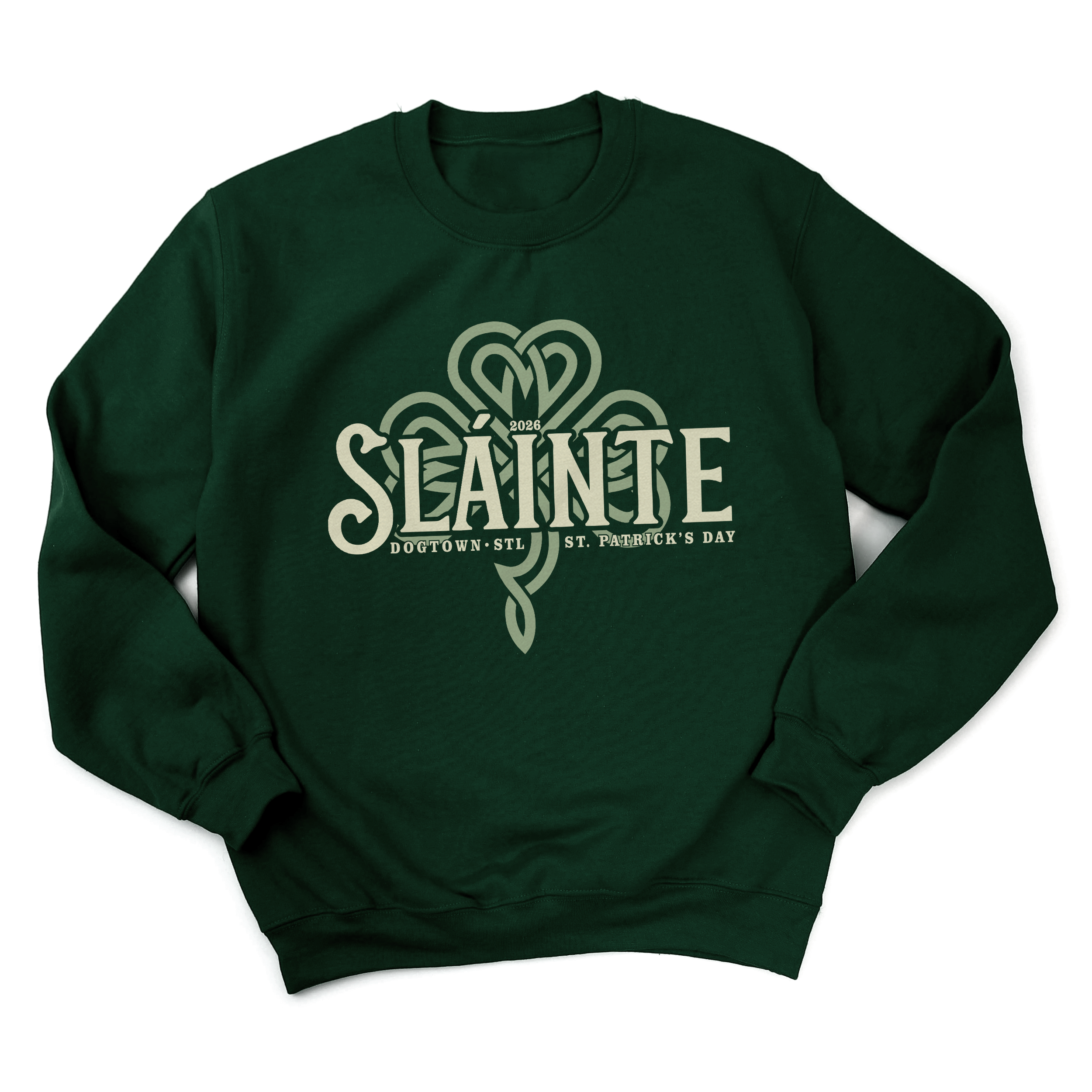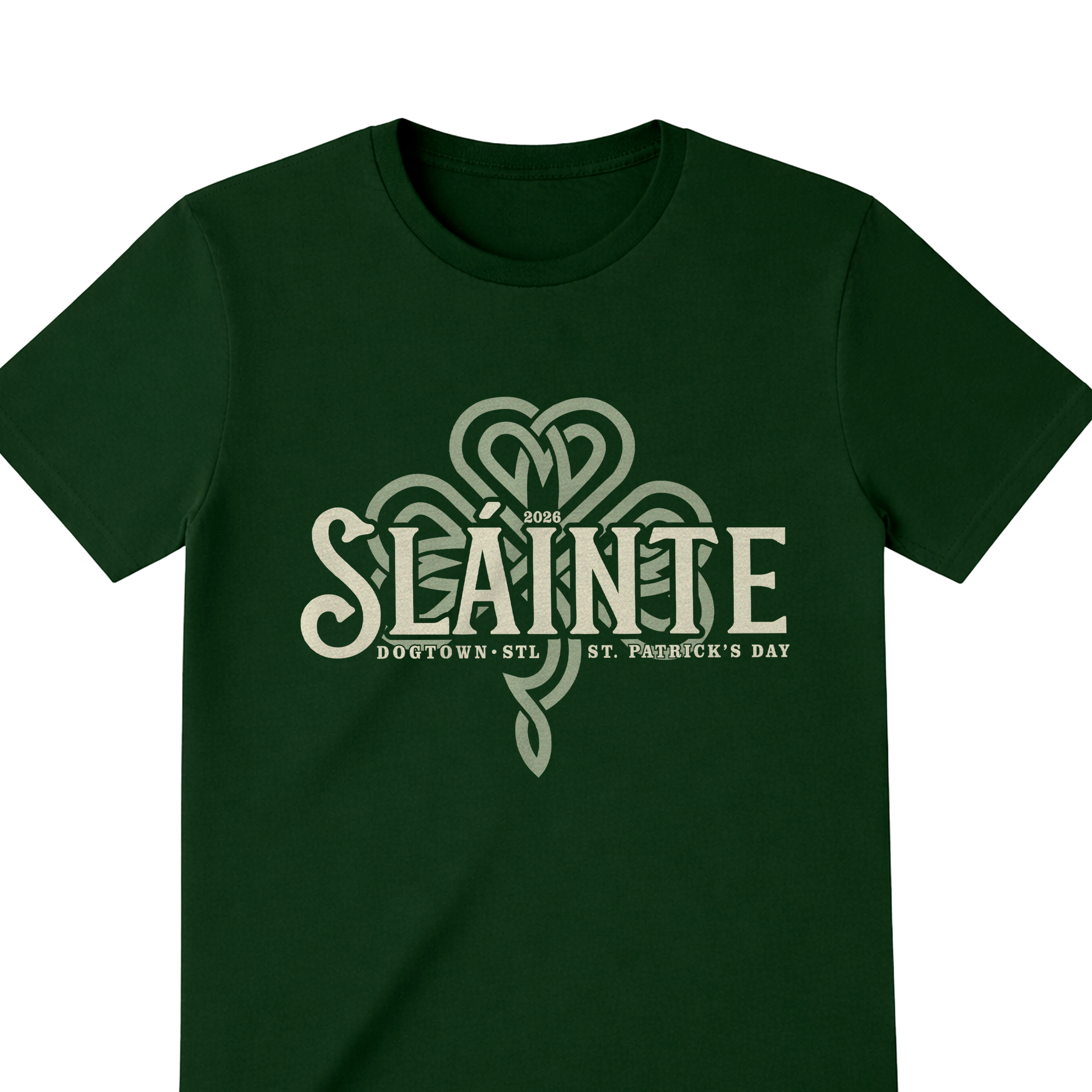 Introducing our official Signature 2026 St. Patrick’s Day design — created to celebrate tradition, community, and a proper Irish toast. Featuring bold vintage-inspired SLÁINTE lettering layered over an intricate Celtic clover graphic, this exclusive design honors the spirit of Dogtown STL and the city’s legendary St. Patrick’s Day celebrations.