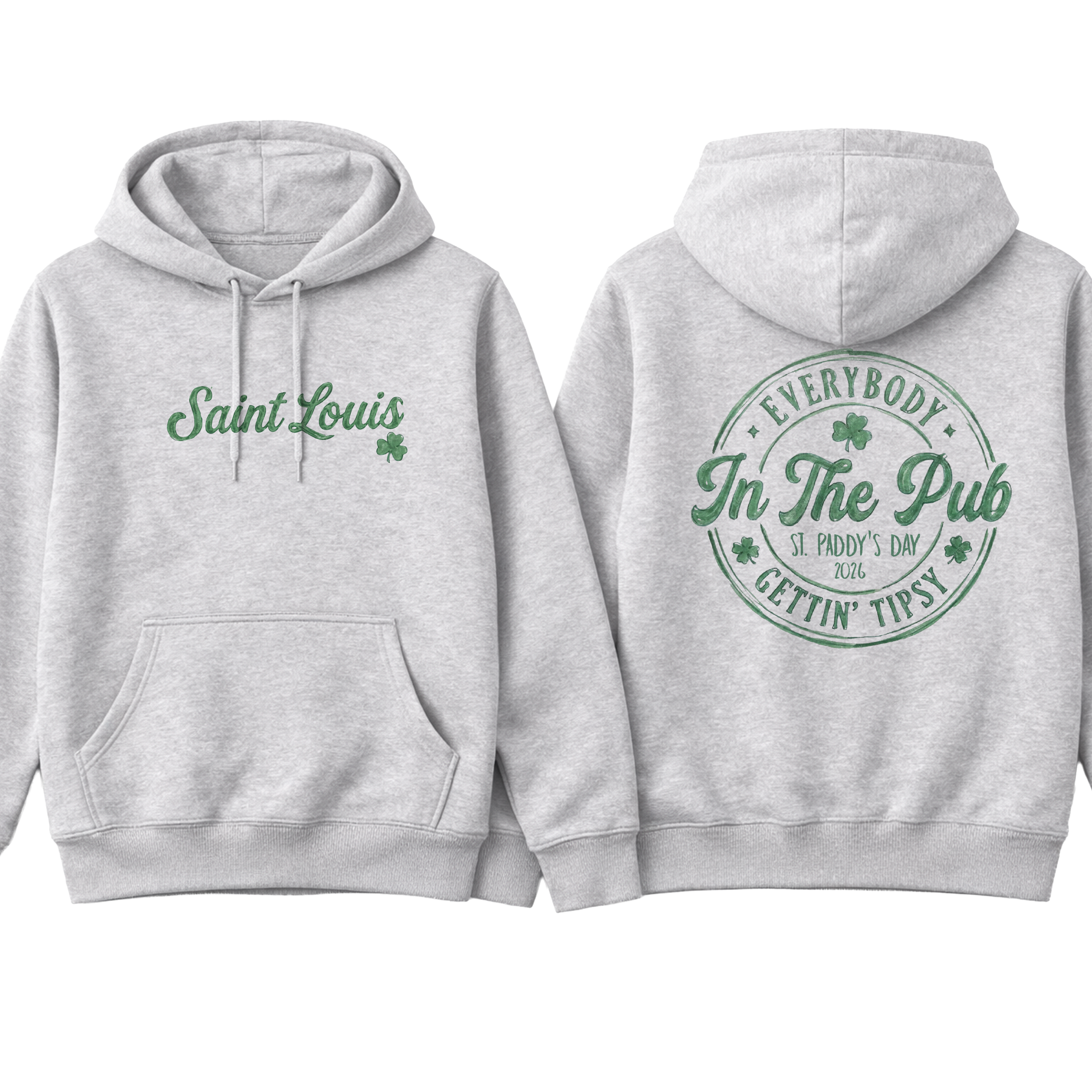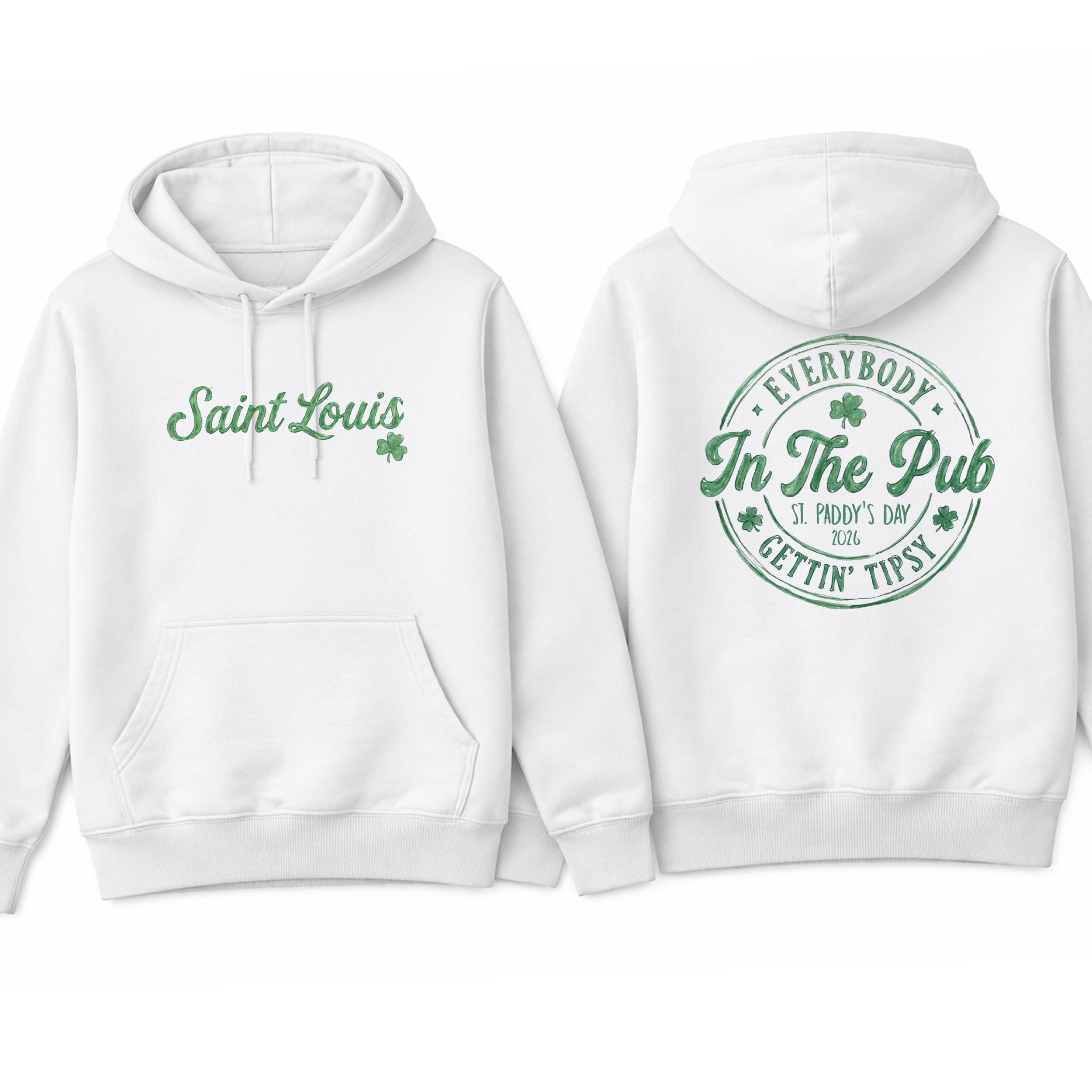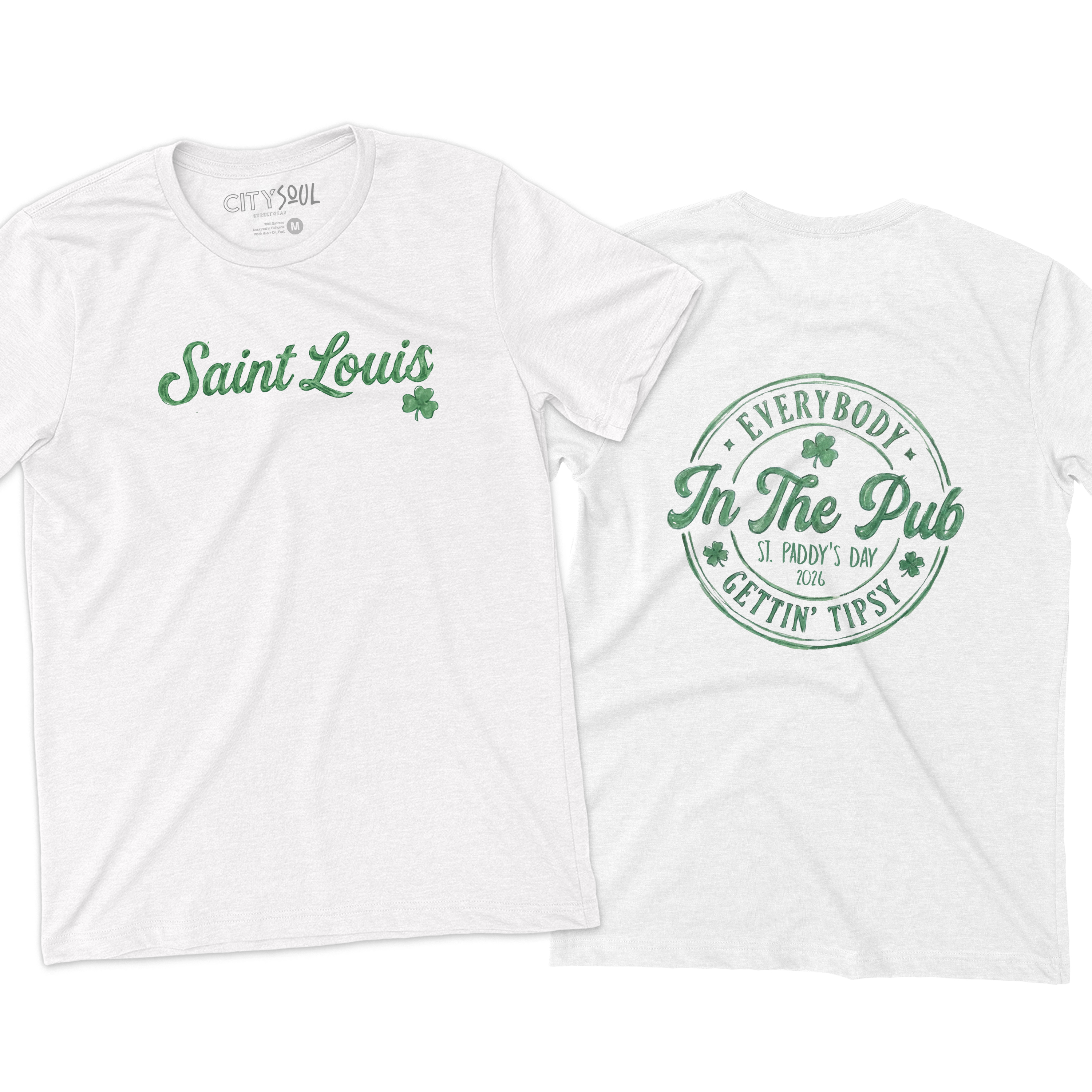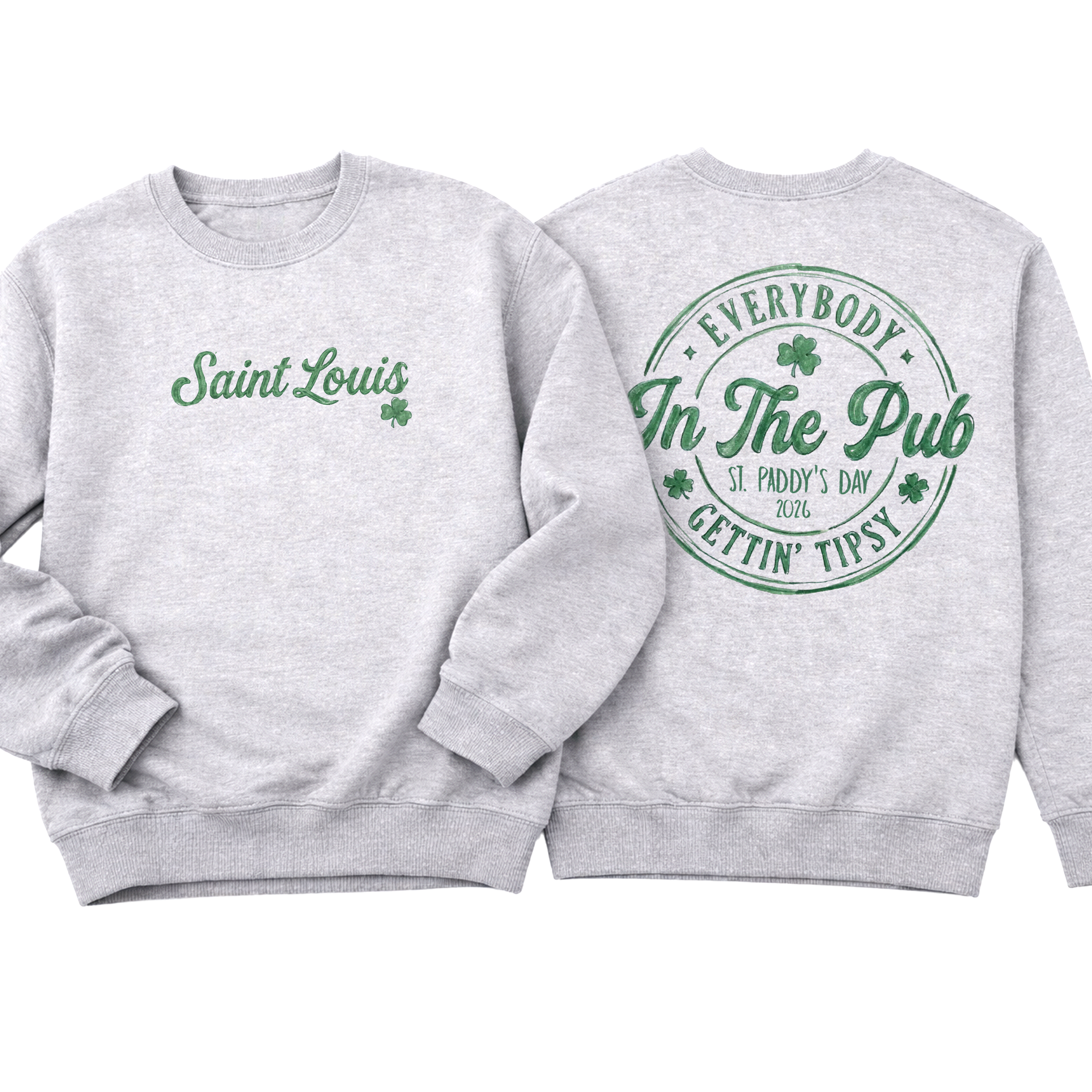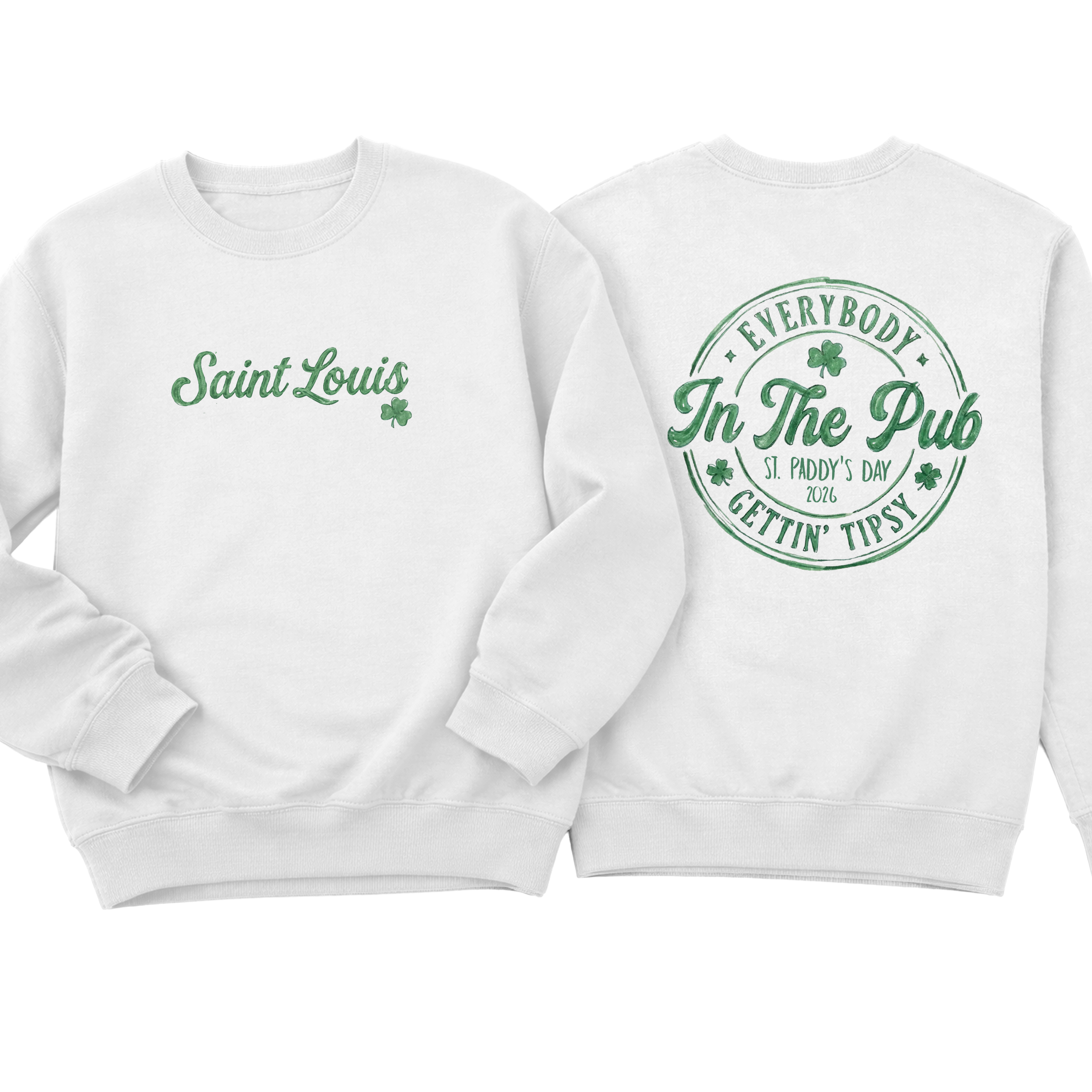 Celebrate St. Paddy’s Day the St. Louis way 🍀 This festive front-and-back design features a vintage watercolor-style emblem with shamrocks, classic circular badge artwork, and playful lettering that reads “Everybody in the Pub Gettin’ Tipsy.” Perfect for parades, pub crawls, Dogtown celebrations, or anyone repping STL pride with Irish spirit.