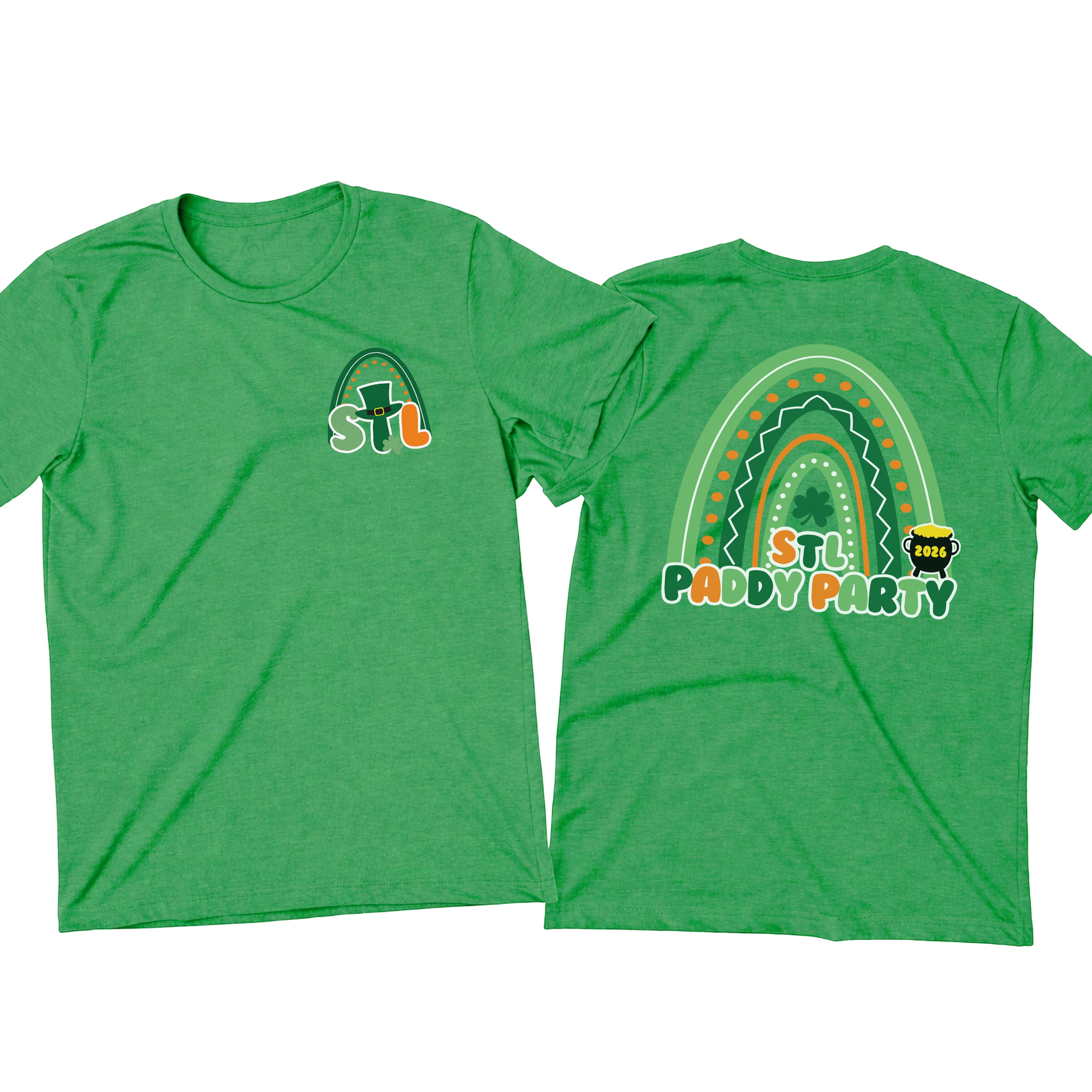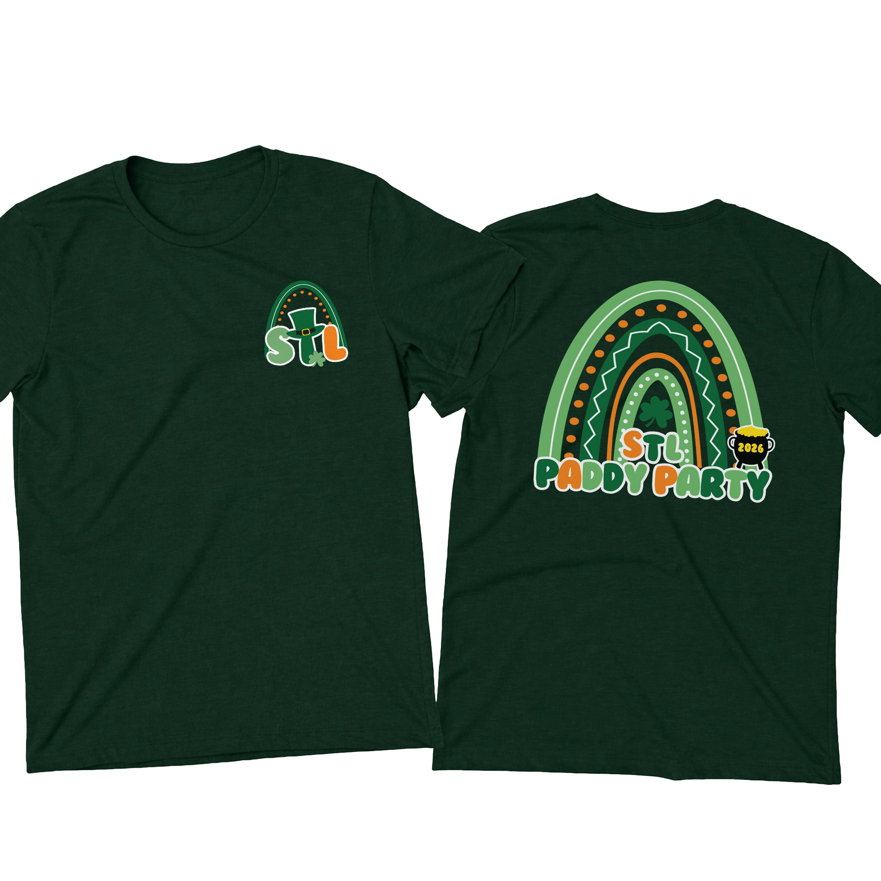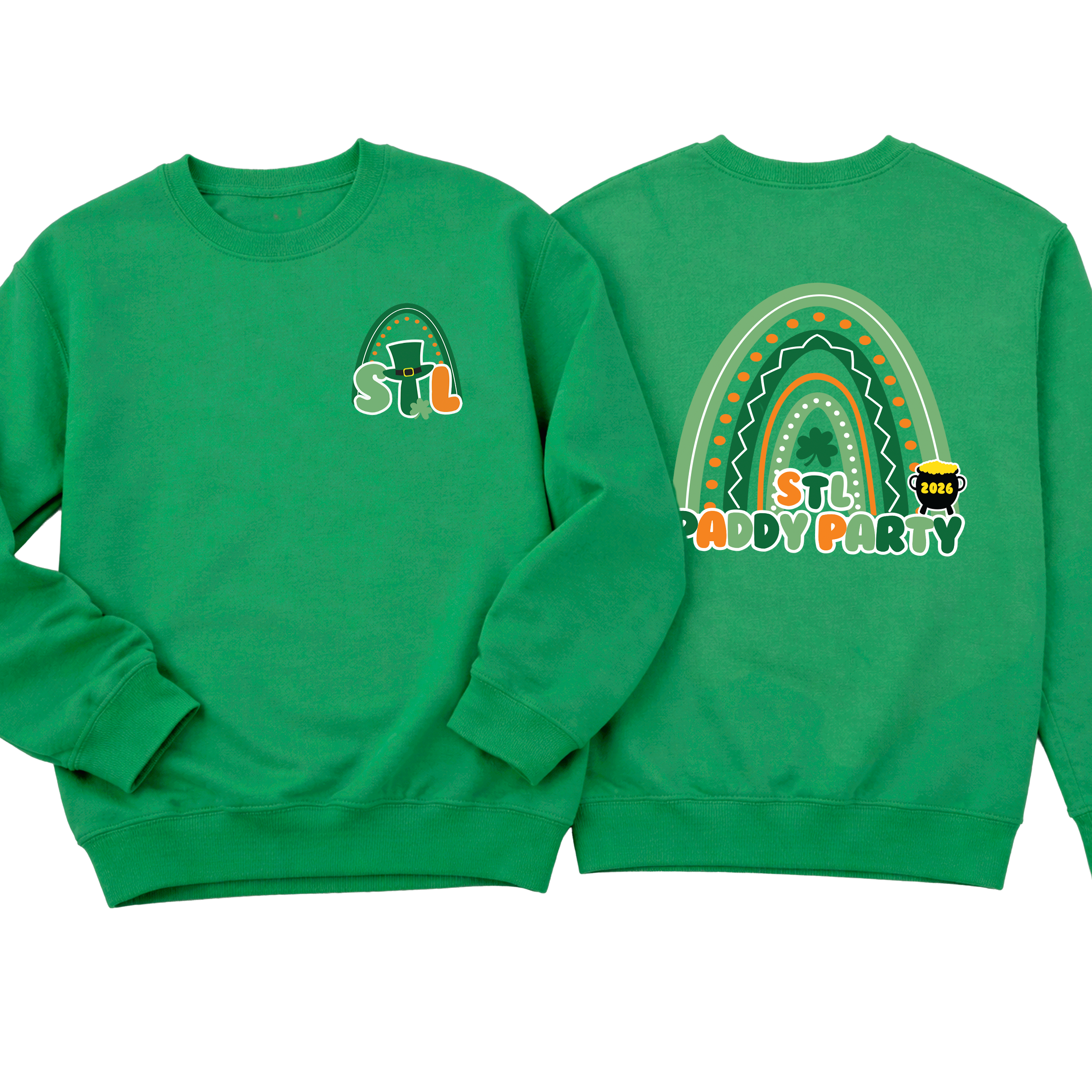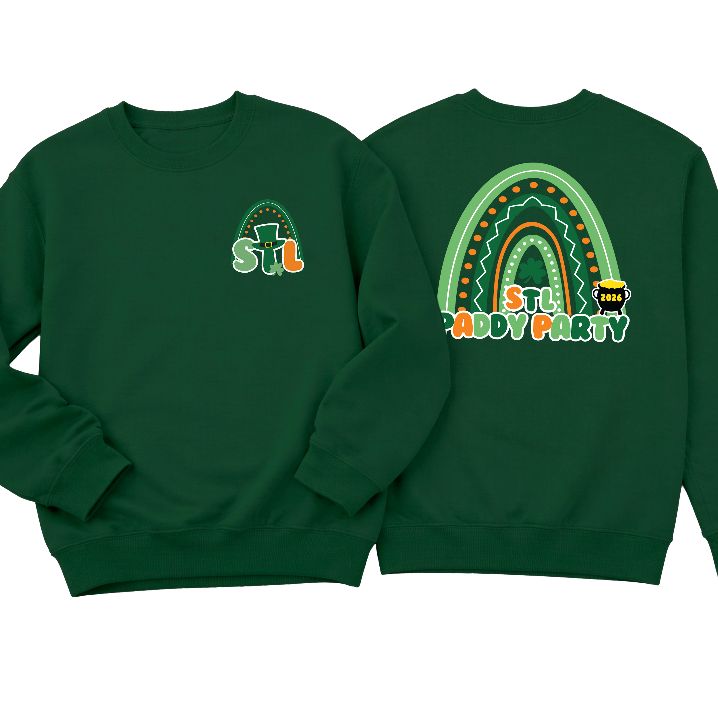 Get ready to celebrate in style with our STL Paddy Party sweatshirts and hoodies — made for parades, parties, and all things lucky ☘️ Featuring a festive rainbow graphic, shamrock details, and playful lettering, this design brings bold St. Louis pride with a fun St. Patrick’s Day twist. The front chest hit adds a subtle festive touch, while the full back design makes a statement wherever you go.