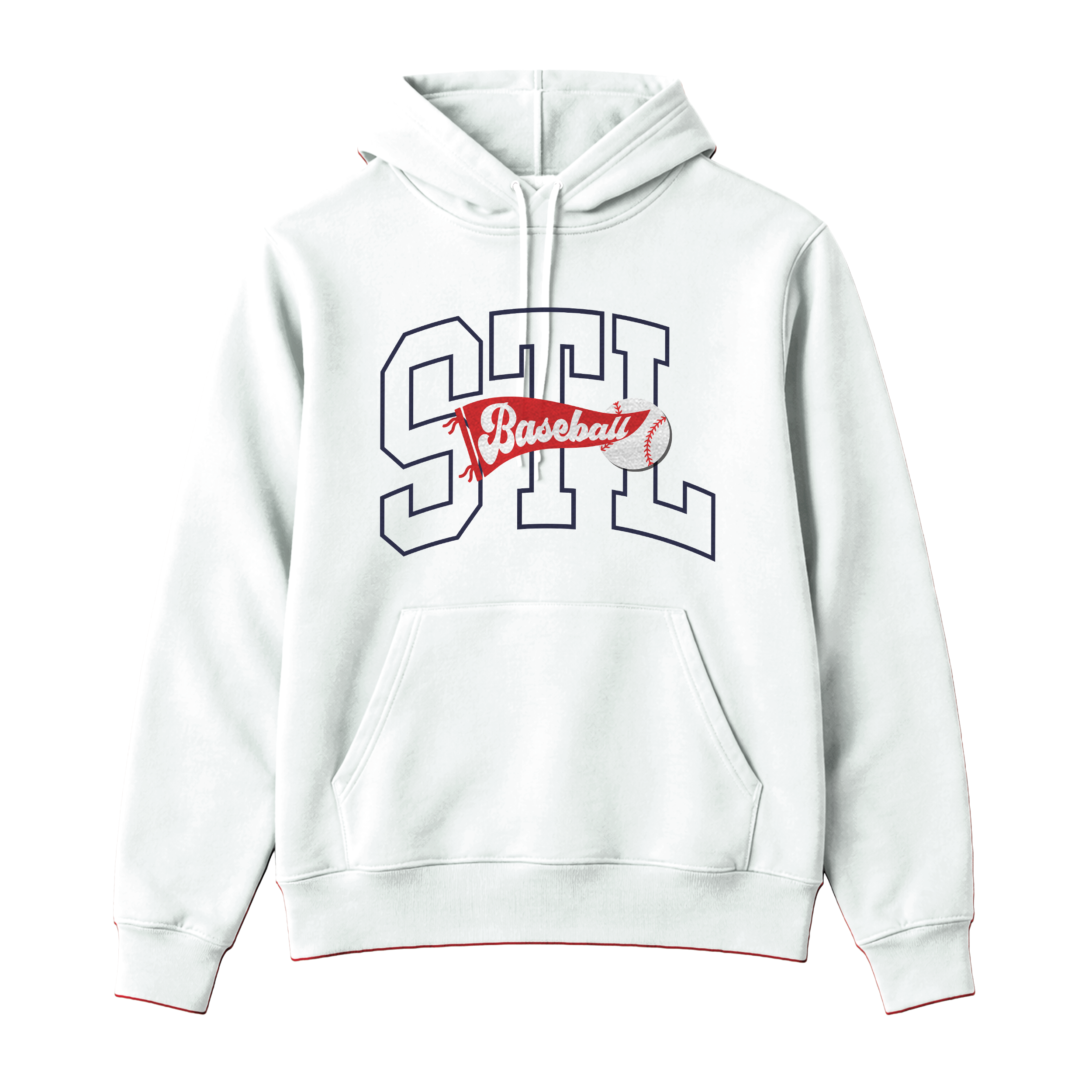 This design features oversized varsity-style STL lettering in a crisp outline, layered with a classic baseball script running through the center—complete with subtle stitch details for that authentic ballpark feel. The mix of strong collegiate lettering and vintage baseball elements gives it that perfect Opening Day energy without trying too hard.